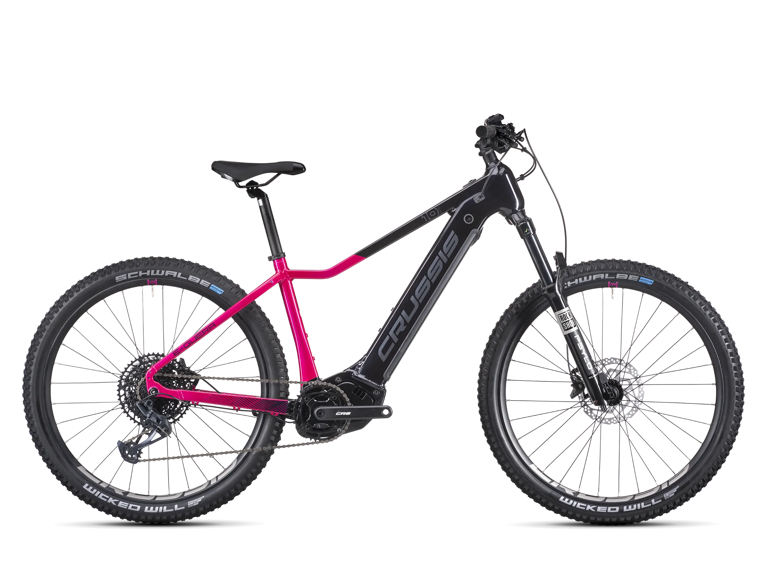 e-Guera 10.10-(720 Wh) se může pochlubit odpruženou vidlicí ROCKSHOX FS Psylo Silver RC Solo Air 27,5″ BOOST, která zaručuje hladkou jízdu i na nerovném terénu. S převodovkou SRAM GX Eagle s 12 rychlostmi se přizpůsobíte jakémukoliv terénu s lehkostí. Jeho kvalitní hliníkový rám v rozměrech 15″, 17″ a 19″ zajišťuje odolnost, zatímco 27,5″ kola s plášti SCHWALBE Wicked Will Evo poskytují vynikající přilnavost a stabilitu na cestách i v terénu.